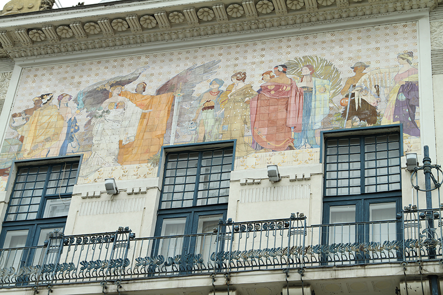 Fassade des Kunstmuseums (ehem. Bukawinaer Sparcassa), figurales Fassadenmosaik „Der Bukowina-Huldigung“, Foto: ⓒ Michaela Seewald (mit freundlicher Genehmigung)