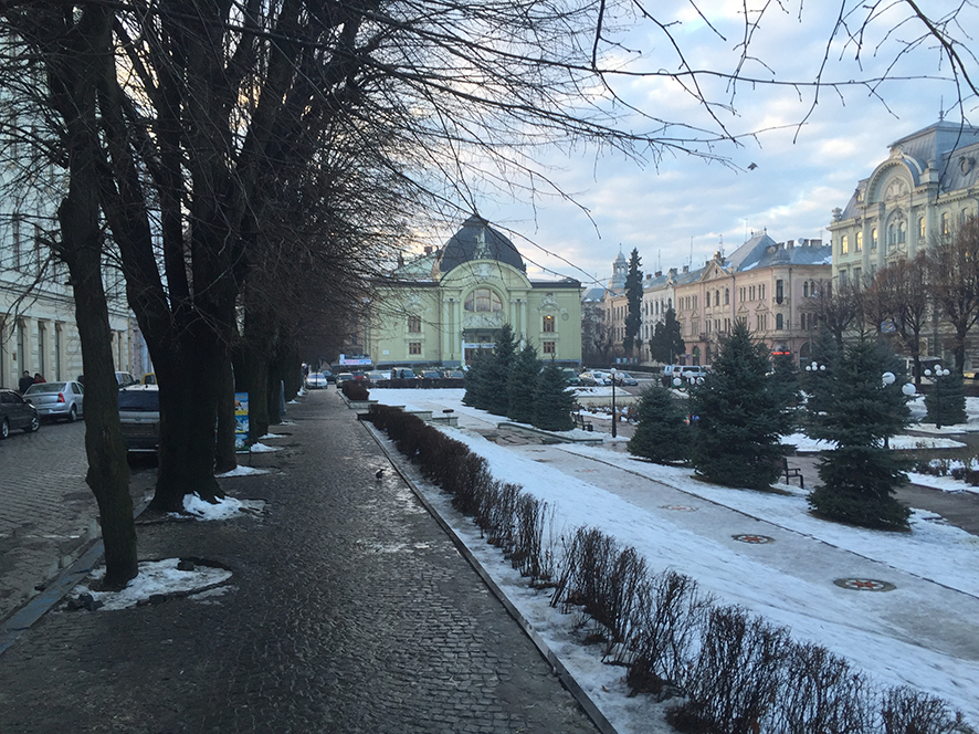 Links: Lysenkastraße (ehemals Rothkirch-Straße), Blick Richtung Jüdisches Haus                                            Rechts: Vulica Olha Kobylanska (ehemals Herrengasse)